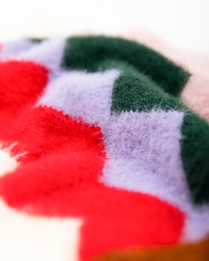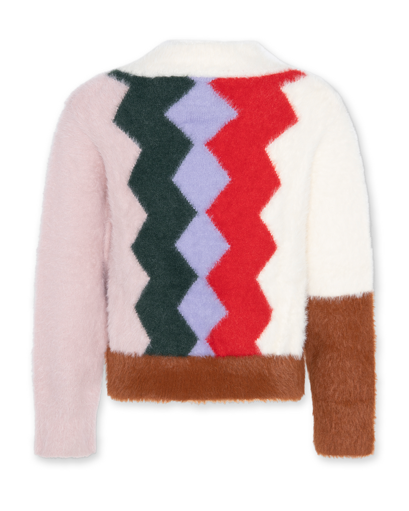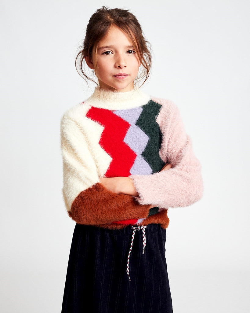 Deze zachte, meerkleurige trui heeft een ronde, iets hogere hals.