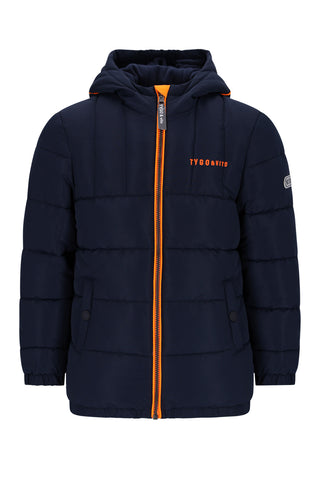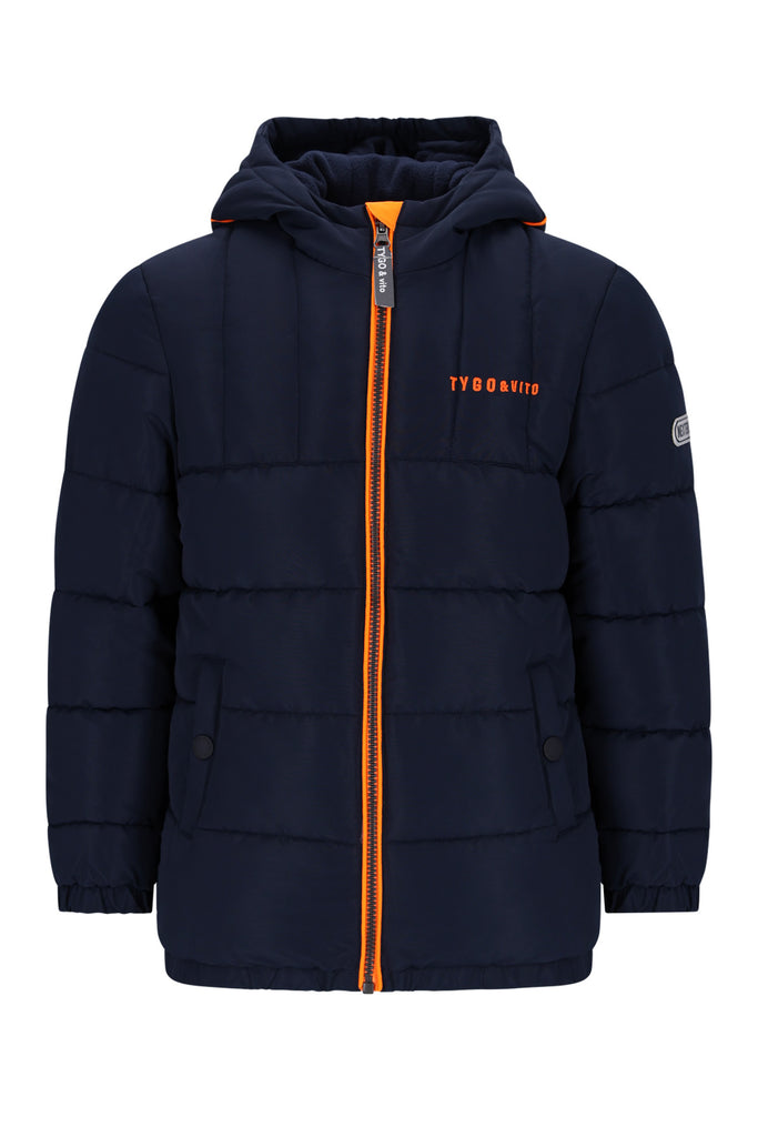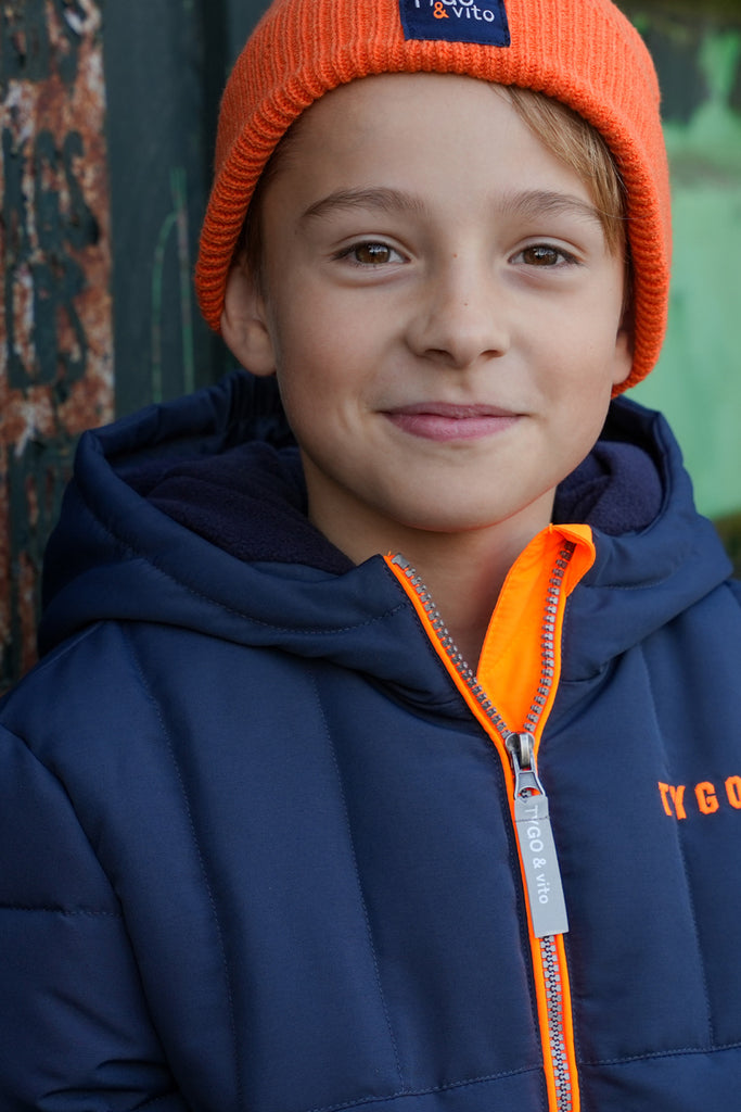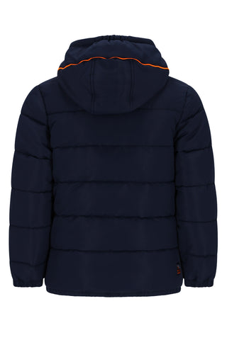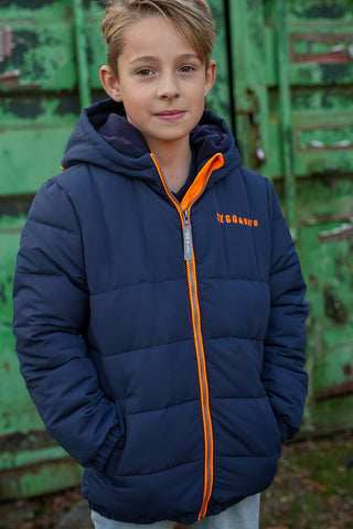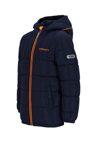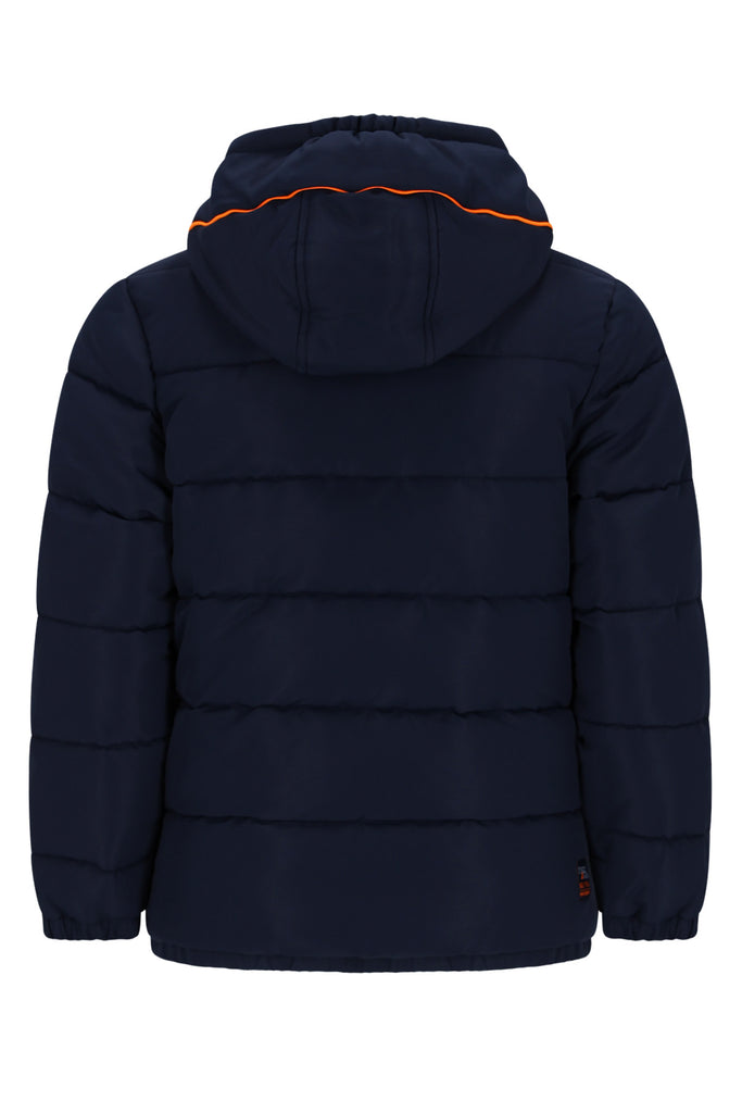 Deze donkerblauwe winterjas heeft een kap en een oranje ritssluiting.